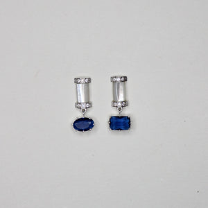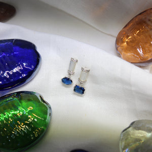 Mismatched, but perfectly so. These dainty drops start with a dome of mother of pearl, framed by diamonds, and finish with two bold blue gemstones — oval on one side, emerald cut on the other. Playful, sparkly, and made to stand out.