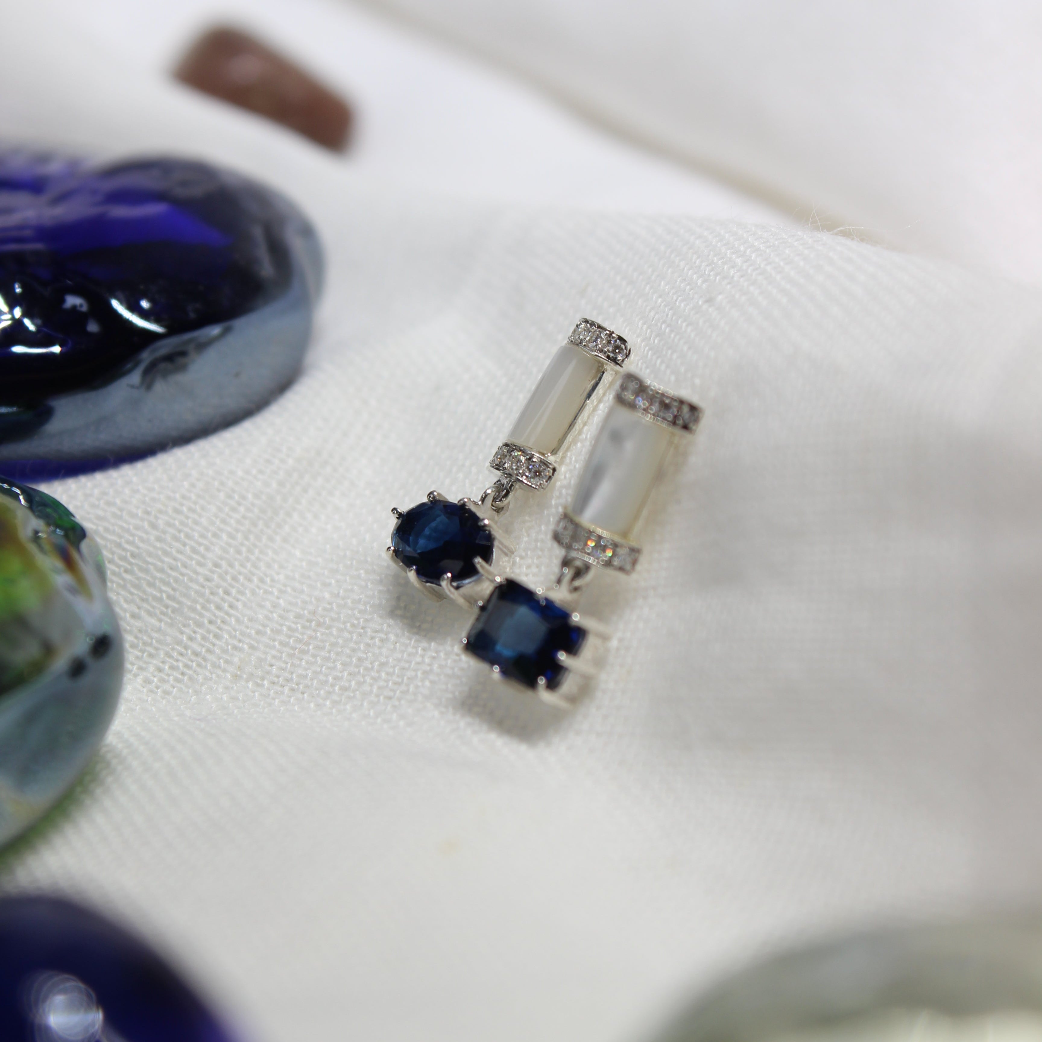 • Design: Dome-shaped mother of pearl top with diamond accents, mismatched blue gemstone drops (oval + emerald cut)