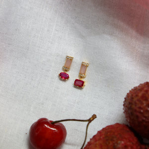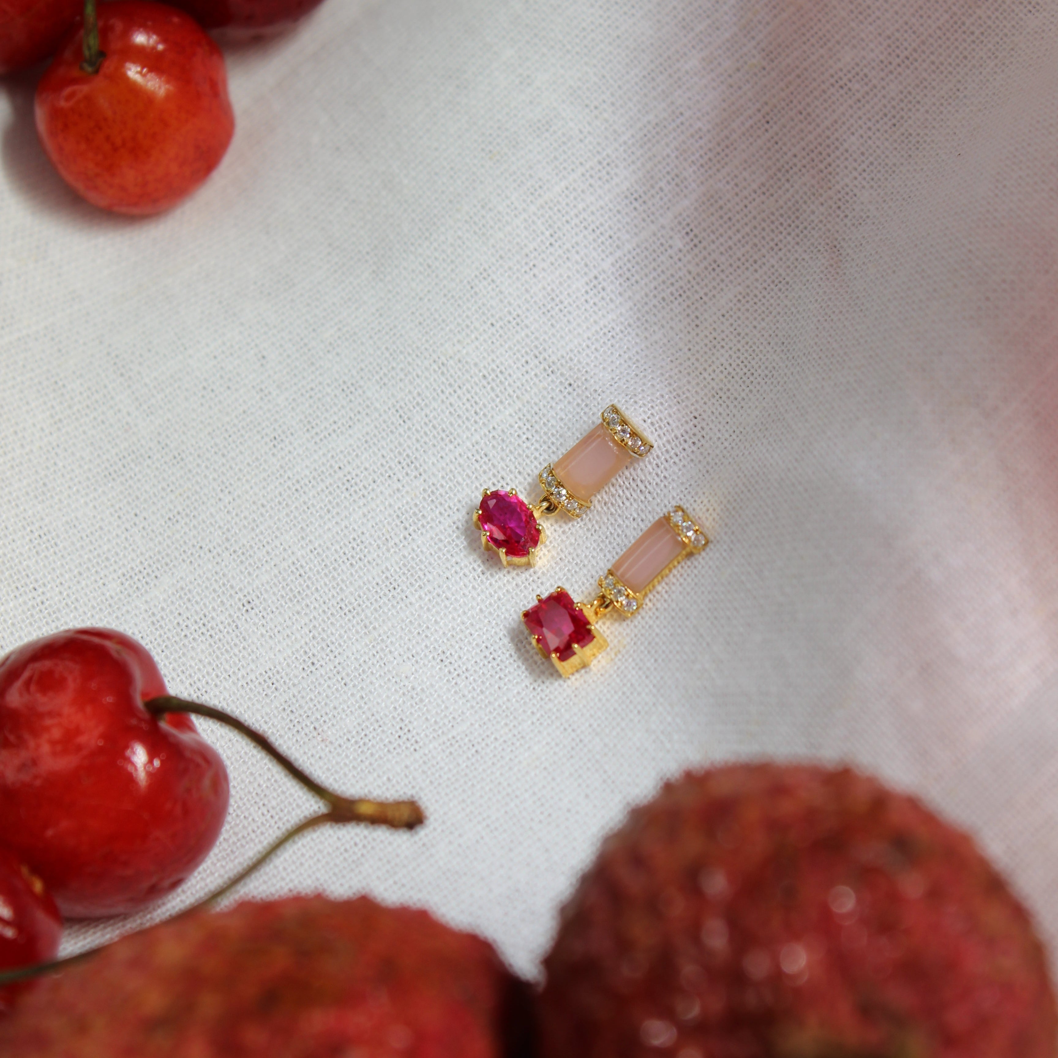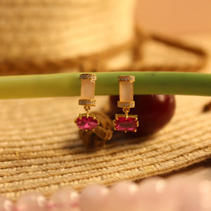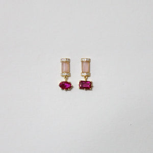 Pretty in pink, with a twist. These earrings pair a rose quartz dome framed by diamonds with mismatched pink gemstone drops — oval on one side, emerald cut on the other. Dainty, playful, and impossible not to notice.