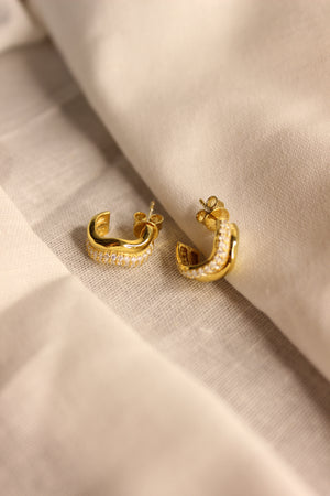 Where shine meets strength. These golden huggie hoops curve in a sleek wave, half polished to a mirror gleam and half lined with pavé zirconia for the perfect balance of bold and bright. A modern twist on a timeless classic — radiant like the sun itself.