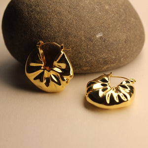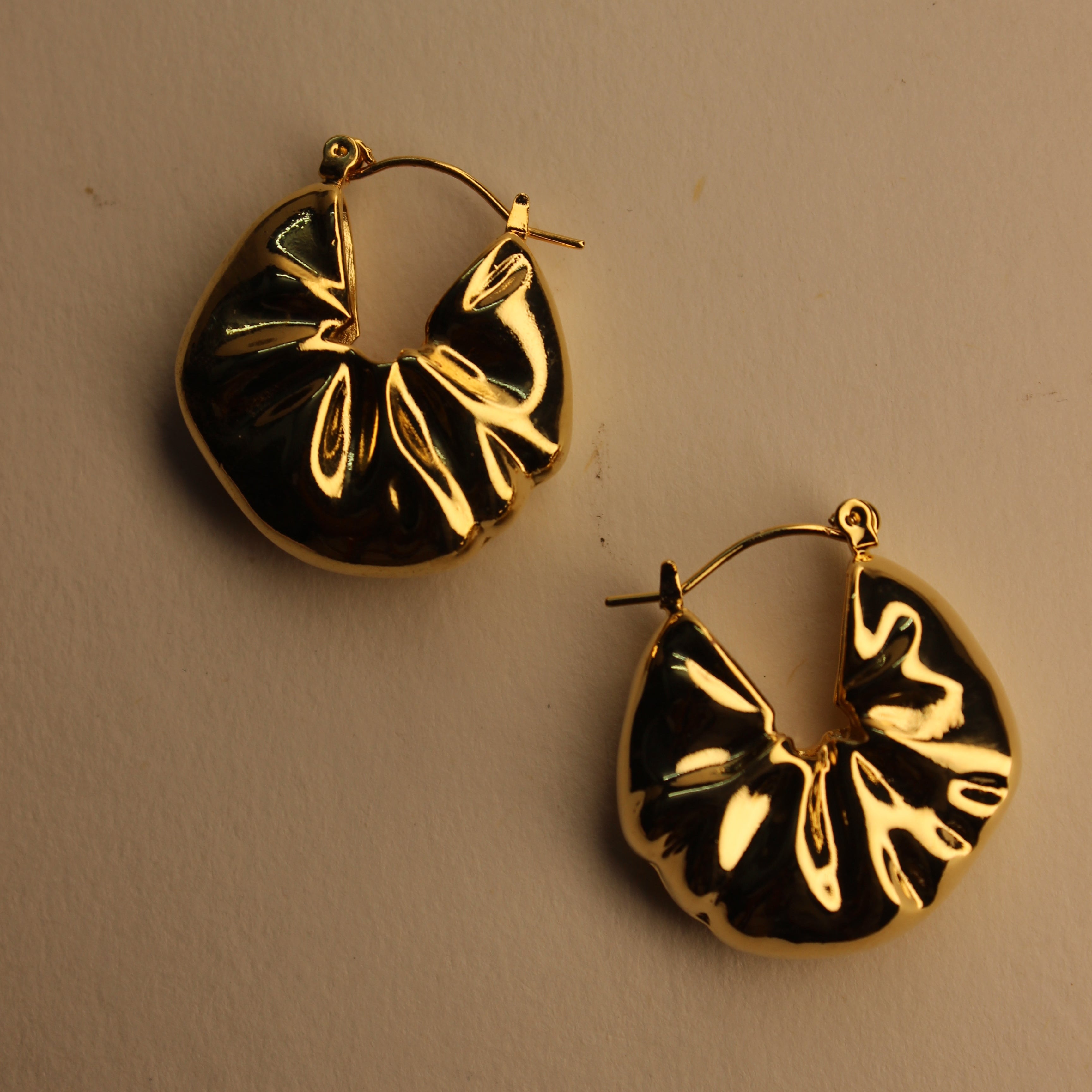 Soft folds, bold statement. These sculptural hoops mimic the delicate curves of a crushed petal, frozen in gleaming metal. Feminine, modern, and unapologetically eye-catching.