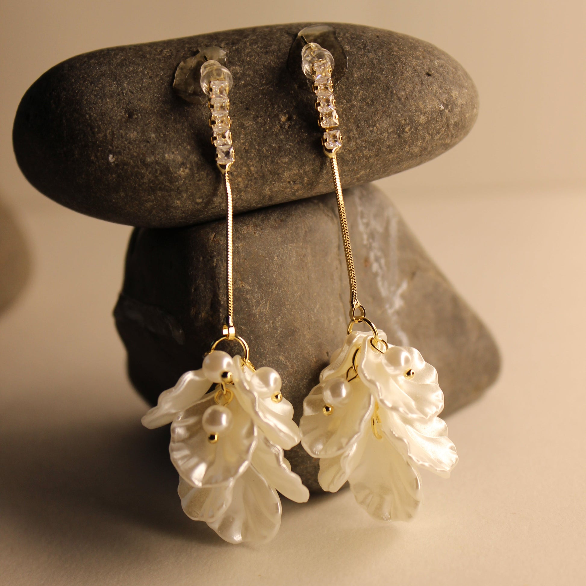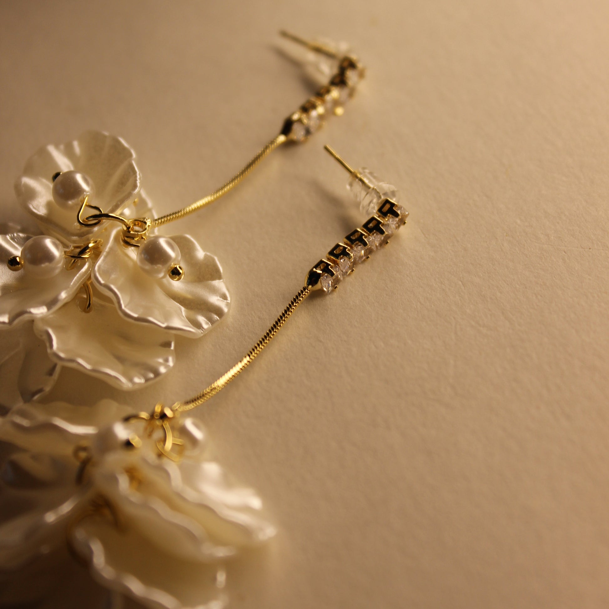 - Design: Dangle earrings with cascading pearl petals, descending round diamonds, and connecting gold string