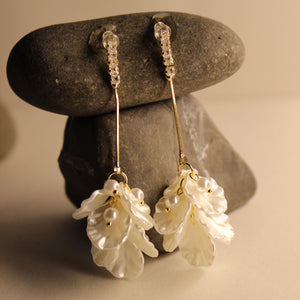 Cascading pearls, sparkling diamonds, and a golden thread of magic. These dangle earrings flow with petal-like pearls suspended from a line of descending round diamonds. Elegant, sculptural, and made to steal every glance.