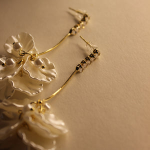• Design: Dangle earrings with cascading pearl petals, descending round diamonds, and connecting gold string