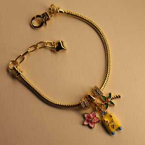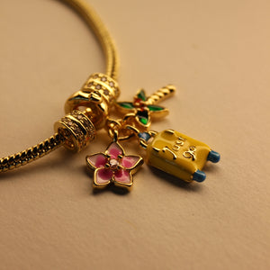• Design: Textured charm bracelet with floral, suitcase, and palm motifs