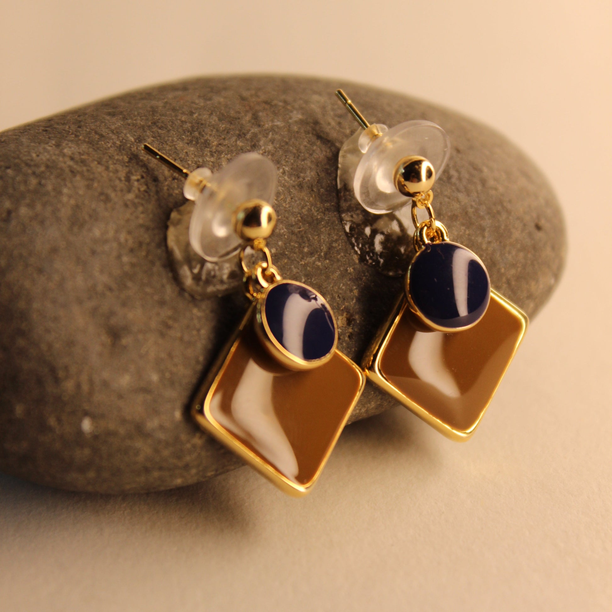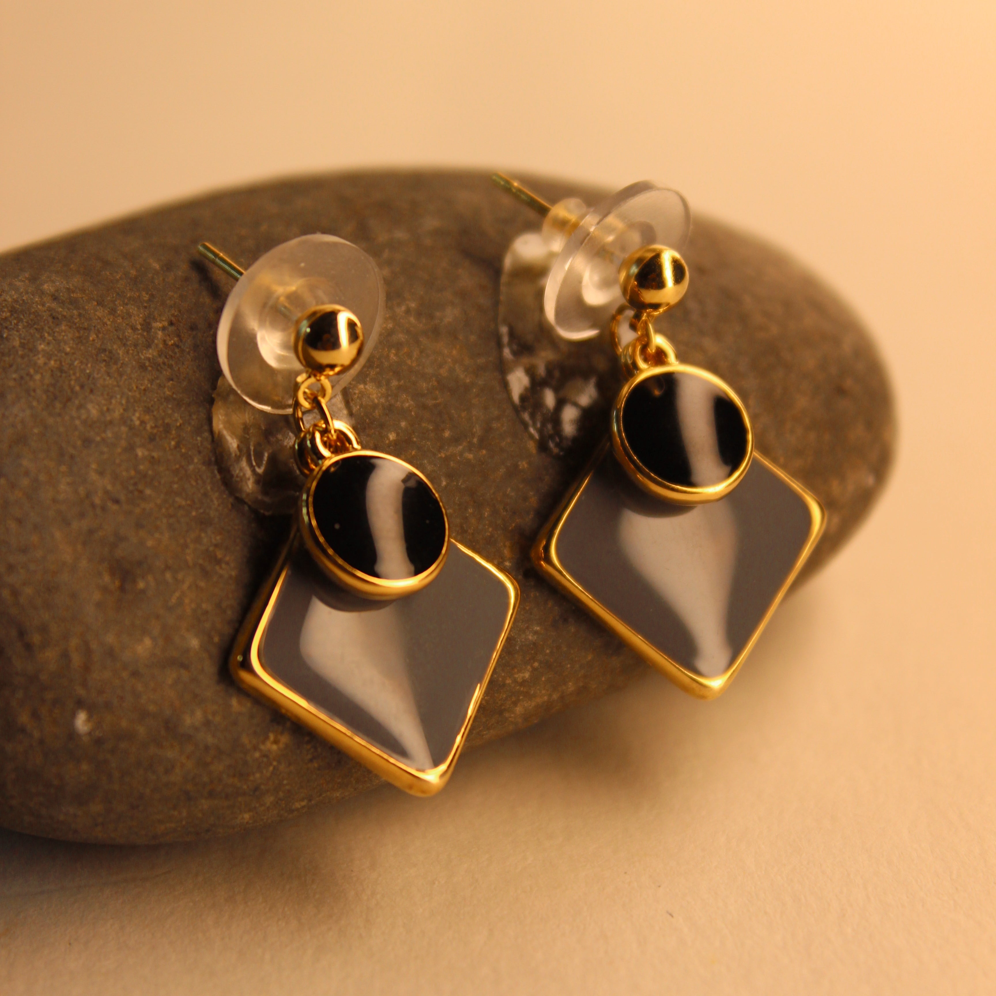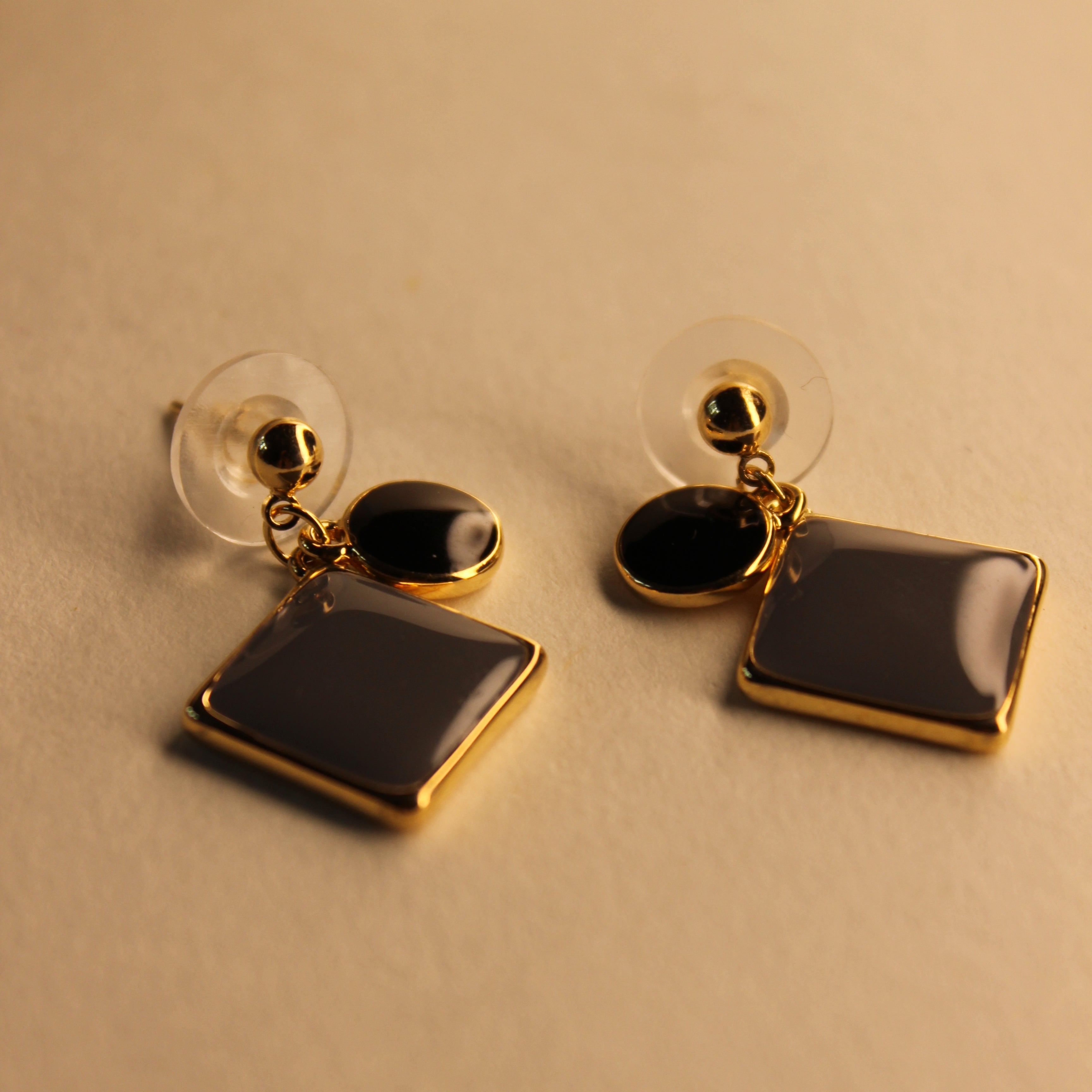 Playful geometry, but make it chic. A diamond-hung enamel square pairs with a round enamel charm that swings with every move. Dainty, bold, and designed to steal the spotlight.