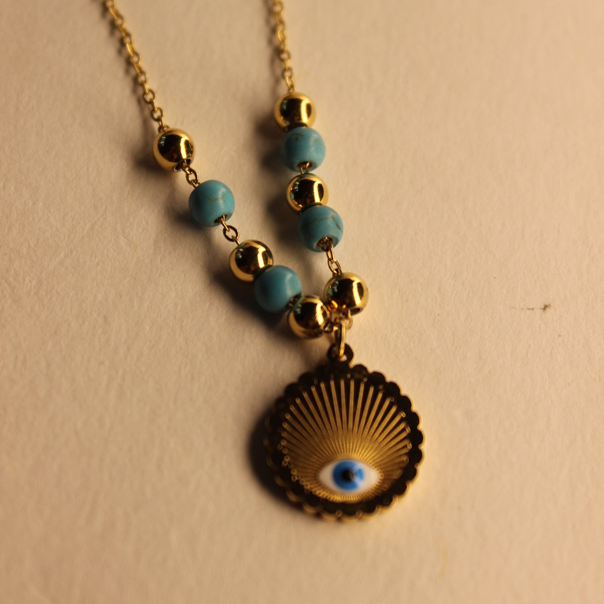 Seyra brings a touch of the sea and a whisper of protection. Featuring turquoise beads and a radiant shell pendant with an evil eye charm, this necklace is made for sun chasers and soul travelers. Whether you’re on a real vacation or just daydreaming at your desk, Seyra keeps the good vibes close.