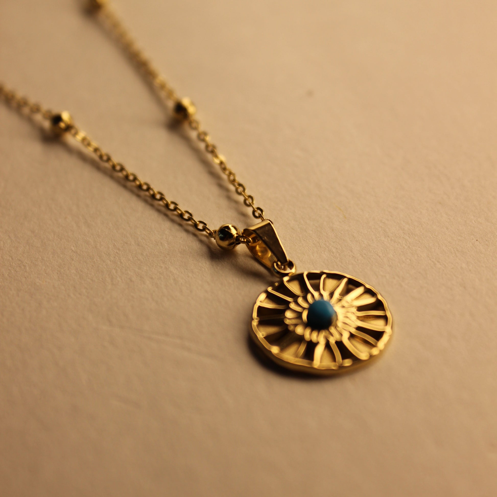 Radiate bold, golden energy with Solara. This sunburst pendant with a turquoise pop is a symbol of warmth, light, and wild freedom. Whether you’re dancing under the sun or manifesting your glow, this necklace is your daily dose of wanderlust.