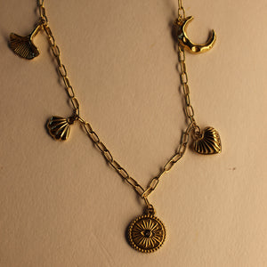 Solune is a story in charms — moonlight, ocean whispers, sun energy, and a heart full of magic. With its golden glow and linked symbols, this necklace wraps you in wanderlust and wonder. It’s not just jewelry — it’s a mood, a memory, and a little bit of magic.