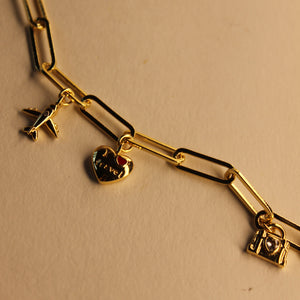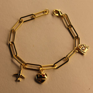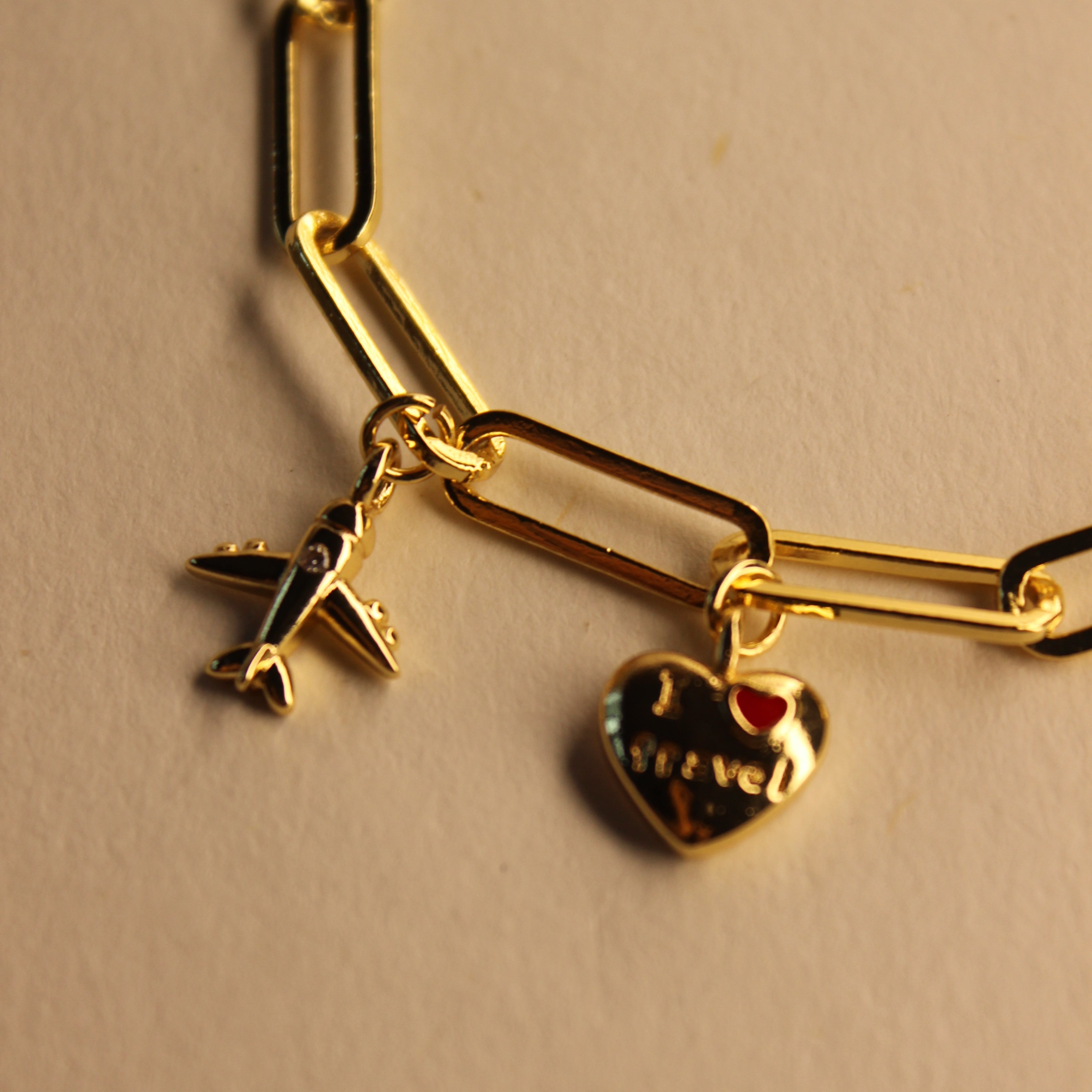 For the dreamers who roam and the souls made of sky — Voyagé is your golden reminder to keep exploring. With bold chain links and travel-inspired charms like an airplane, suitcase, and heart, this bracelet is a statement of freedom, style, and wanderlust. Wherever life takes you, take Voyagé with you.