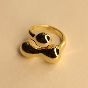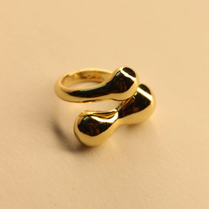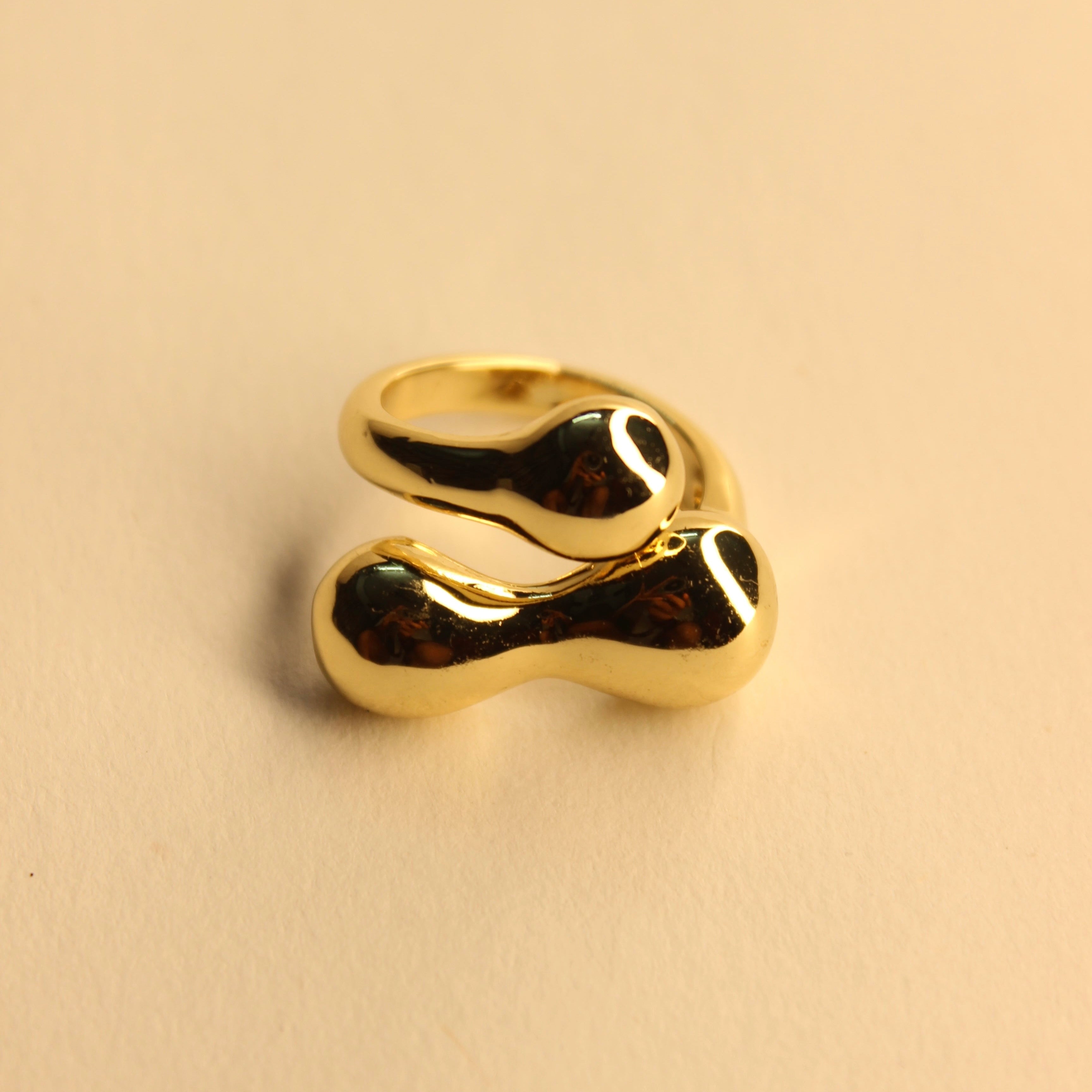 The Zyra ring is unapologetically bold. A sculptural double-drop silhouette that feels like fire frozen in form. With curves that echo natural strength and golden polish that glows with intention, Zyra is made for the ones who move differently.