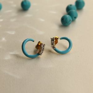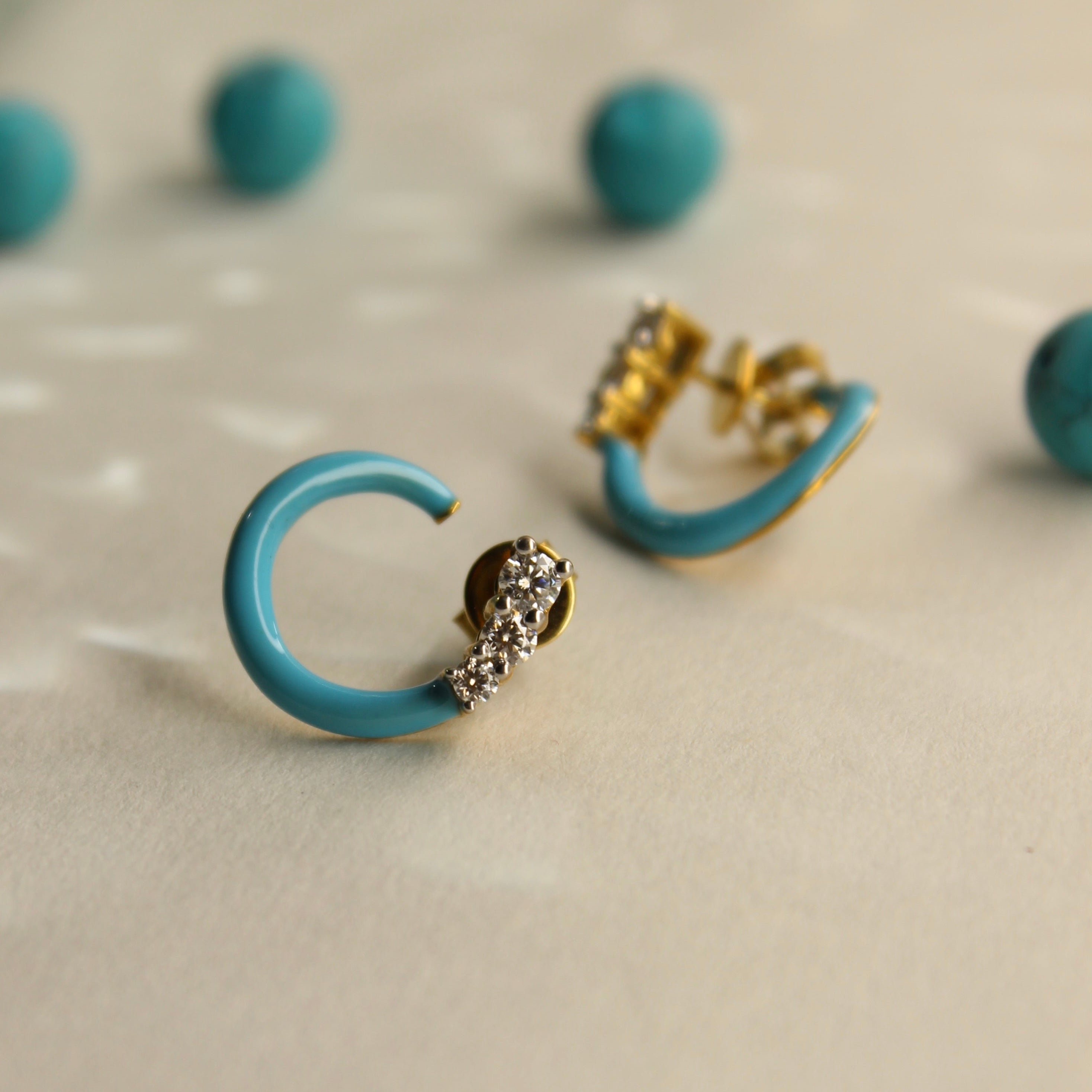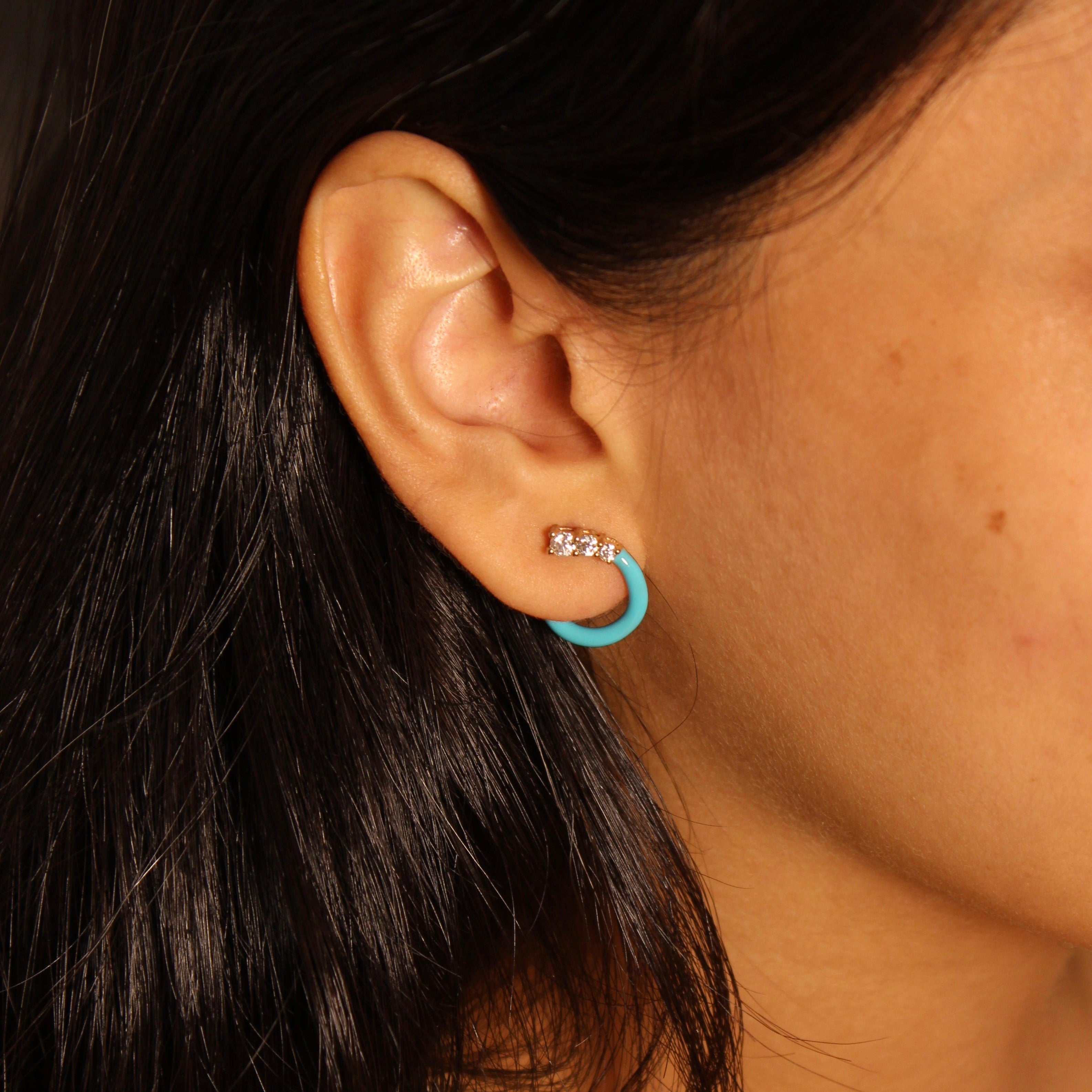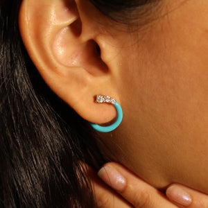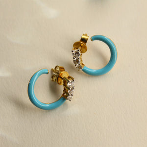 A pop of blue with a touch of sparkle. These enamel huggies are finished with three graduated moissanite stones that twinkle like stars against a clear sky. Playful, dreamy, and perfect for stacking.