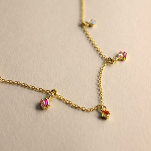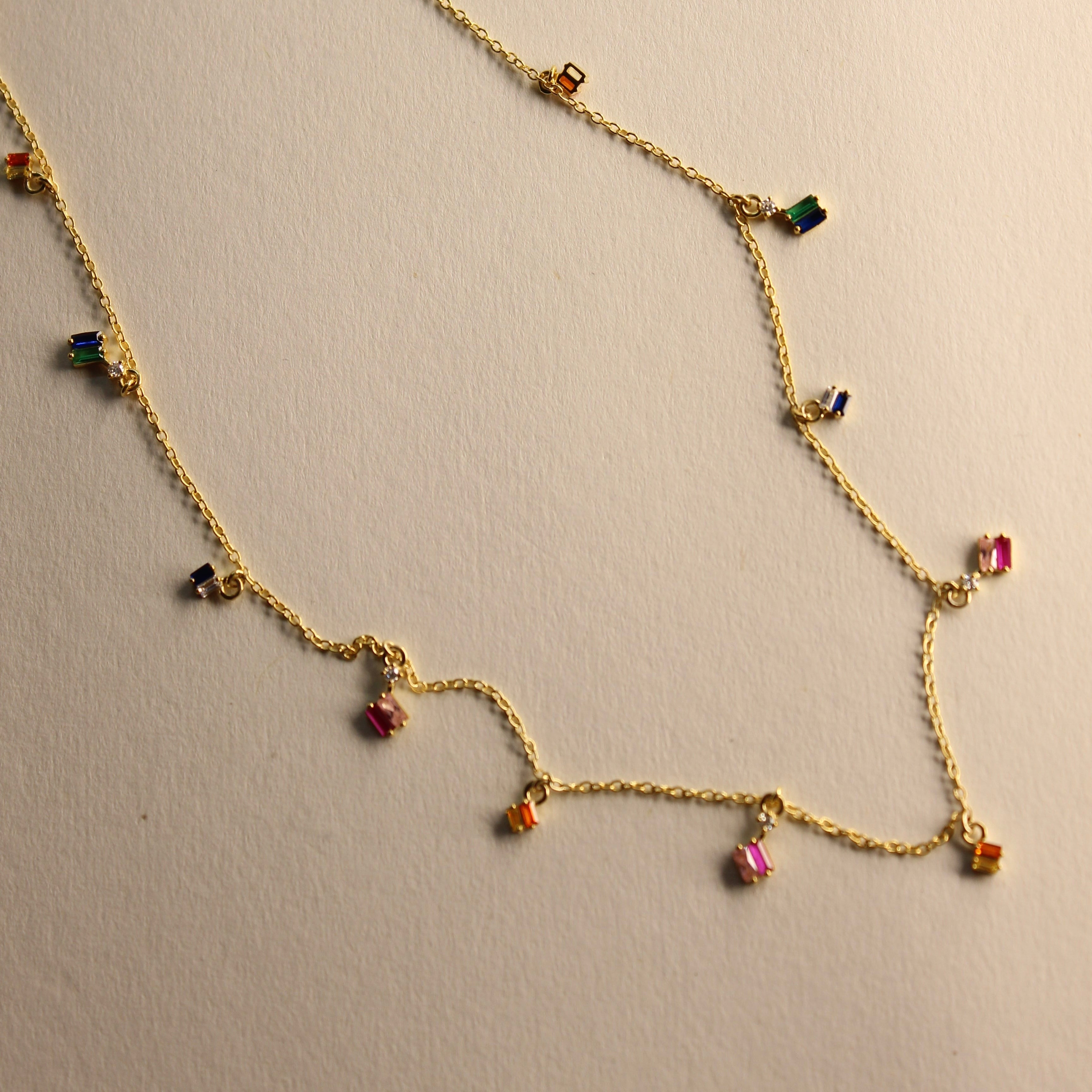 • Design: Dainty chain with baguette-cut pastel + bright stones