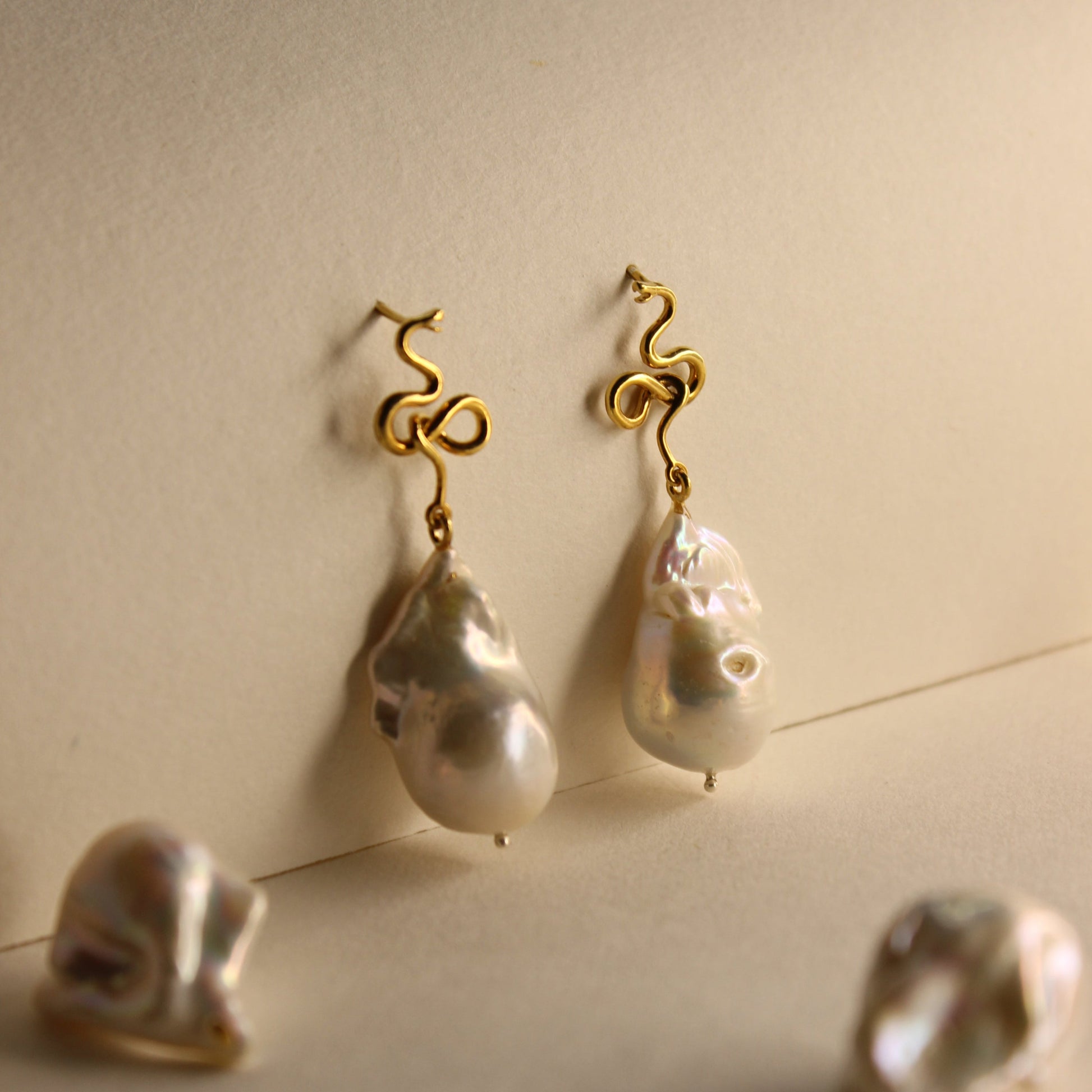 A twist of silver, a drop of pearl. These earrings flow with an S-shaped top that curves like a wave, finished with a luminous baroque pearl at the bottom. Elegant, fluid, and naturally one of a kind.