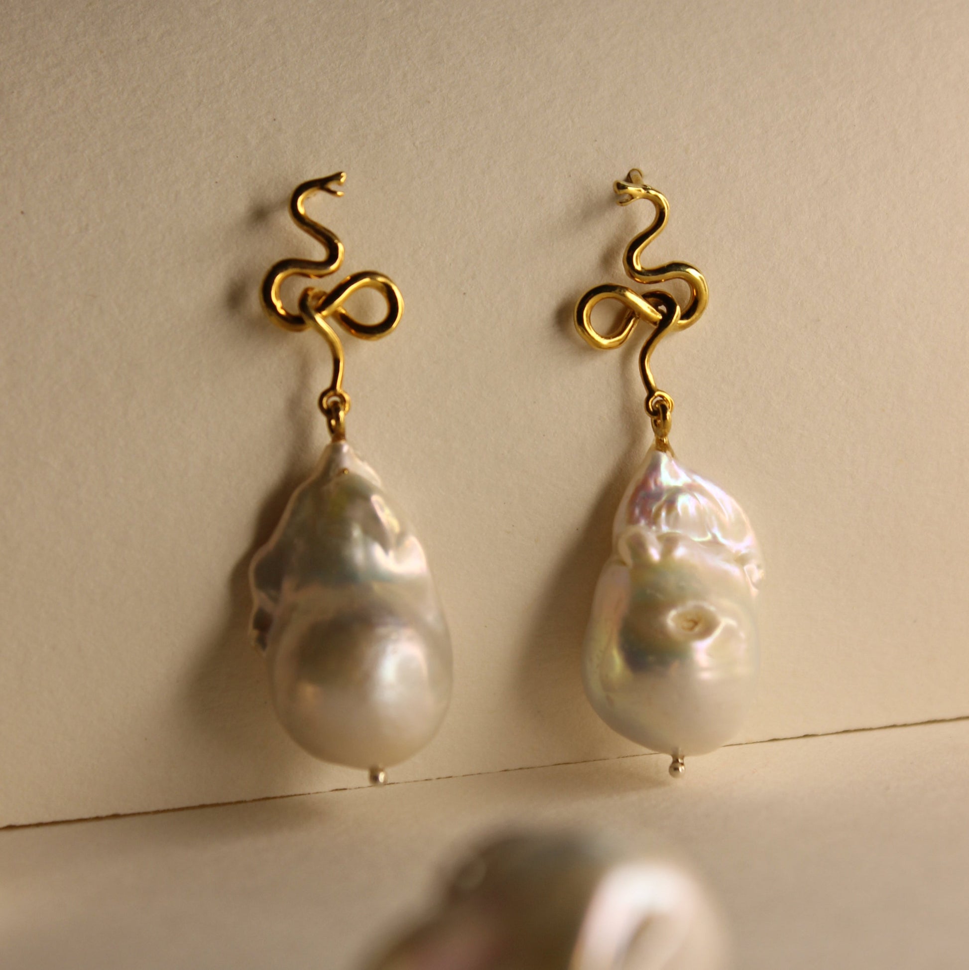 - Design: Intertwined S-shaped top with hanging baroque pearl